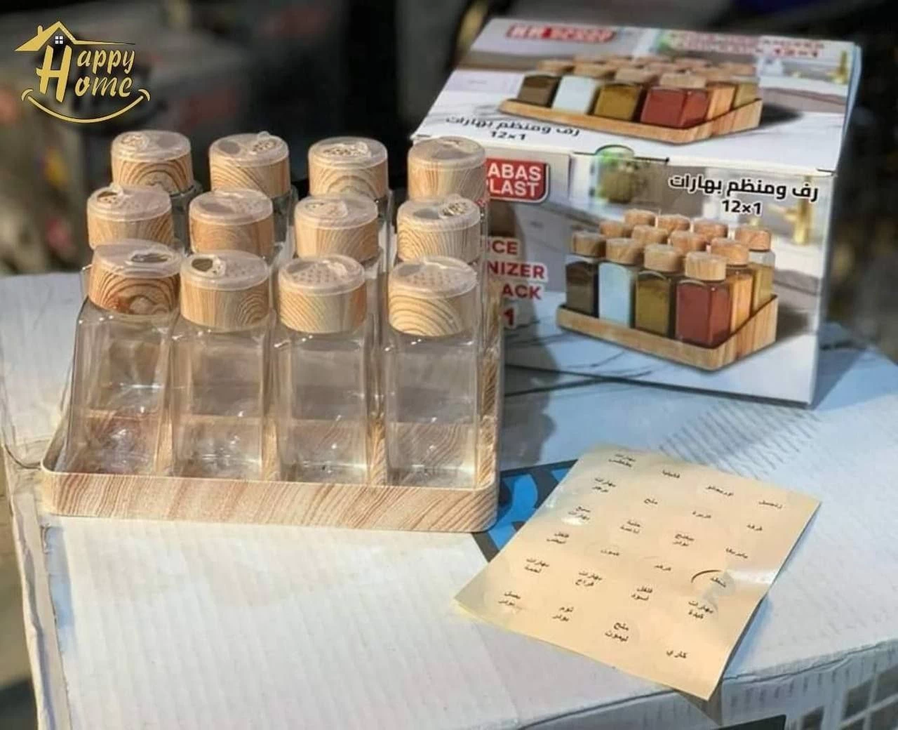 - محتويات الطقم: 12 برطمان توابل + ملصقات + رف تخزين