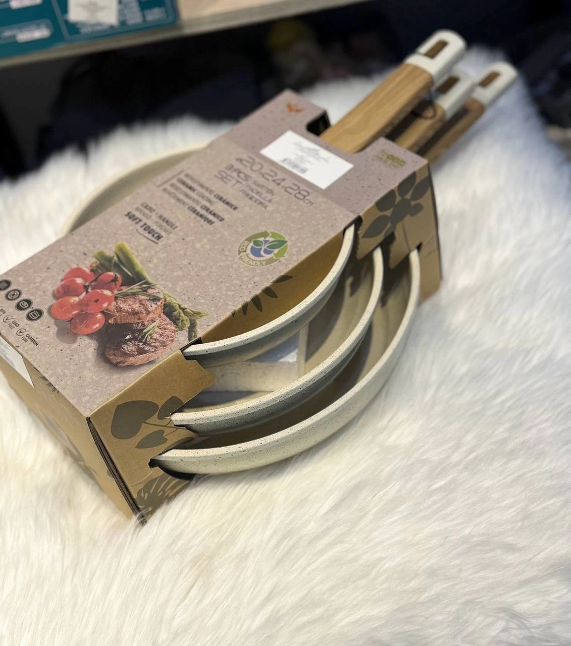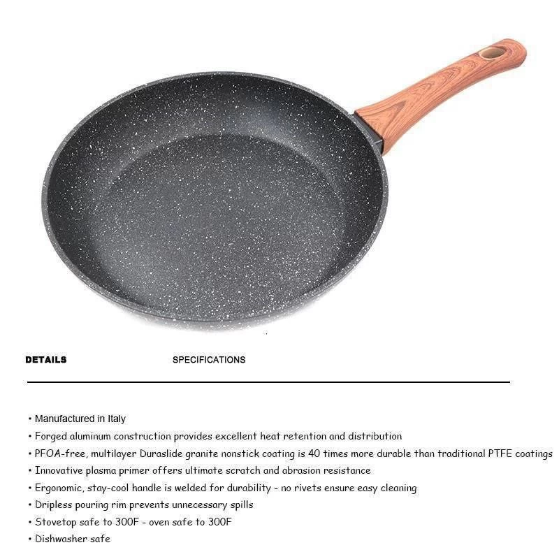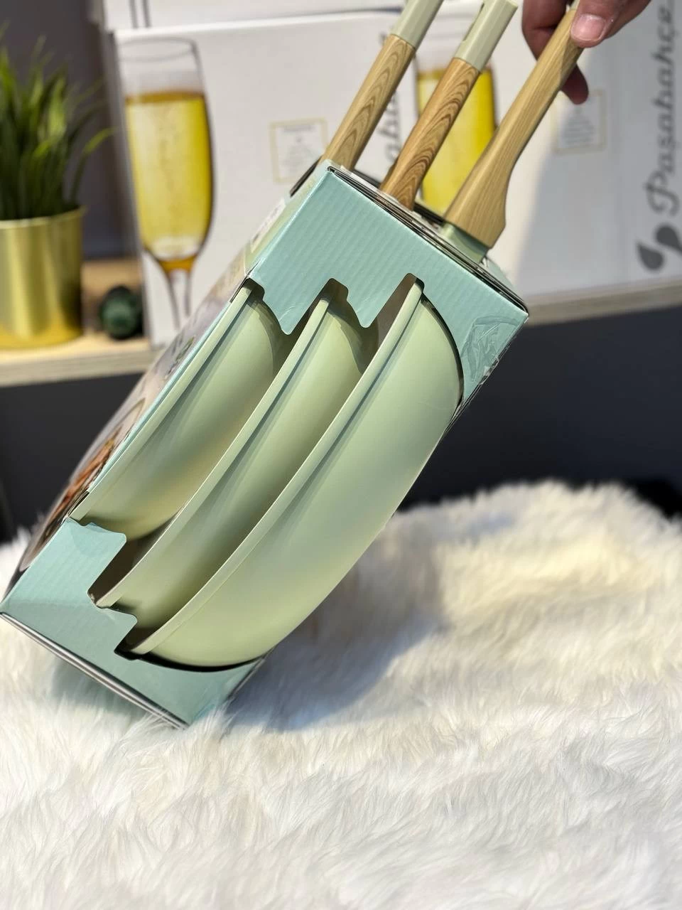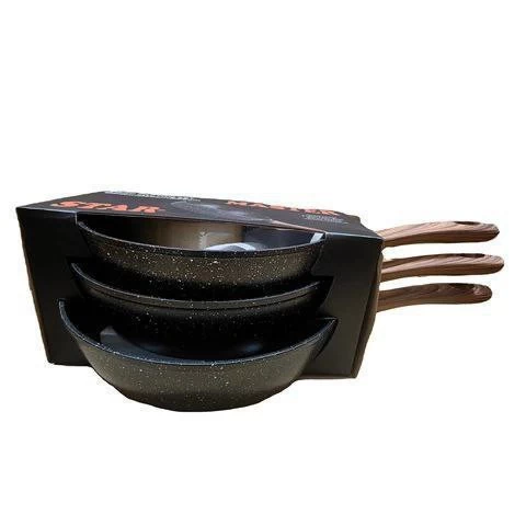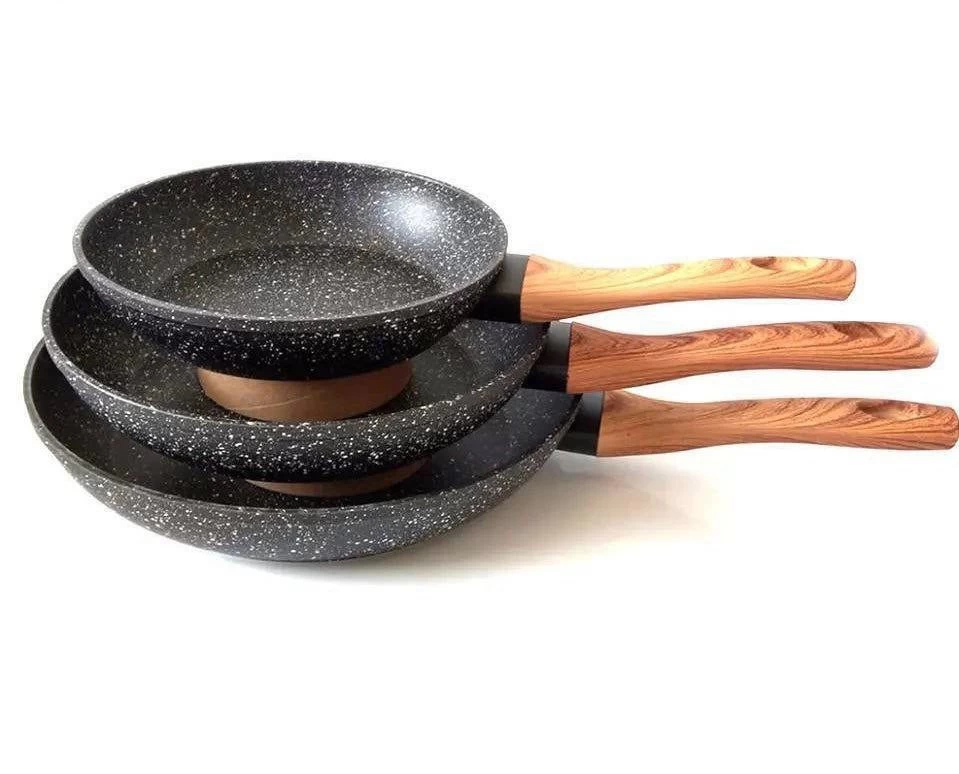 طقم مقلاة جرانيت 3 قطع بمقبض خشبي - مقاوم للحرارة