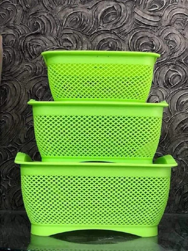 حافظي على ترتيب منزلك مع طقم سلال التخزين البلاستيكية المكون من 3 قطع، والتي تأتي بأحجام مختلفة لتلبية احتياجات التخزين المتنوعة. مصنوعة من بلاستيك صحي عالي الجودة، مما يجعلها مثالية لغسل الخضروات والفواكه، تخزين مستلزمات المطبخ، أو تنظيم أدوات الحمام والدولاب. تحتوي على أغطية محكمة الإغلاق للحفاظ على المحتويات نظيفة وآمنة، مما يجعلها خيارًا مثاليًا للاستخدام المنزلي المتعدد. تتوفر بألوان أنيقة لتناسب جميع الأذواق.