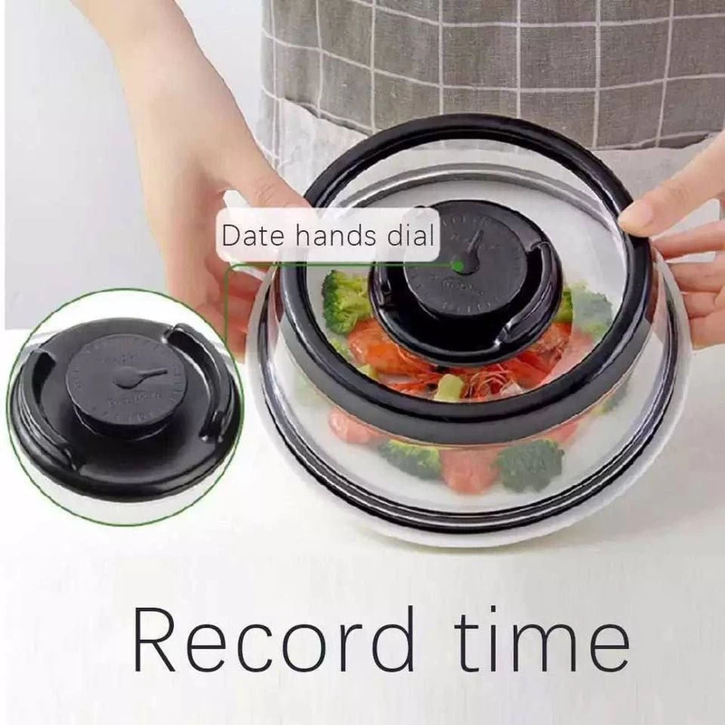 • يحتوي الغطاء على قرص يدوي يشبه الساعة يمكنك استخدامه لضبط تاريخ تخزين الطعام في الطبق.