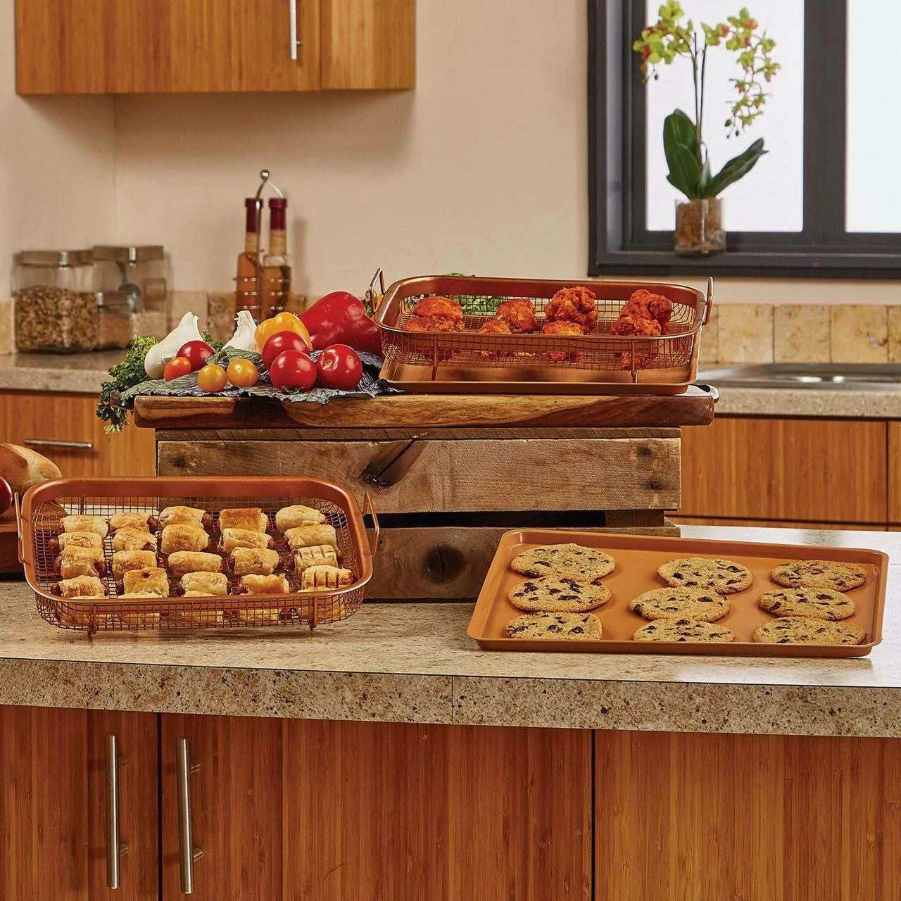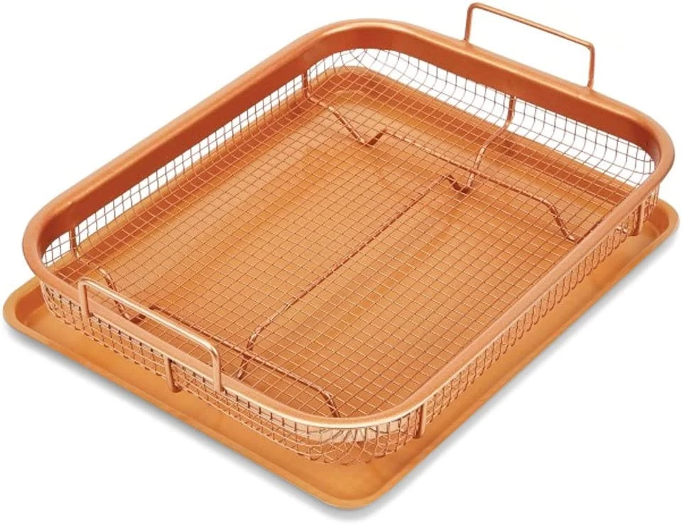 • رائع للرقائق والدجاج المقلي. توقف عن إهدار المناشف الورقية. تسمح صينية الهريس النحاسية بمرور الشحوم إلى الصينية السفلية وتترك لك طعامًا مقرمشًا مطهوًا بشكل مثالي. يمكنك الآن خبز وقلي وتحميص الأطعمة المفضلة لديك كلها بنفس المجموعة.