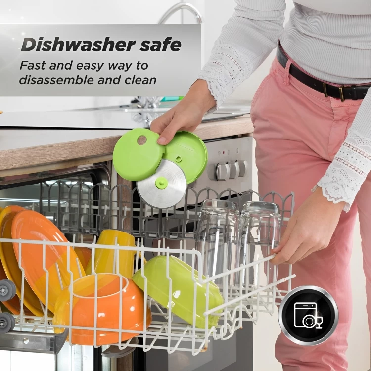 • يمكن إزالة شفرة قاطعة البيتزا هذه تمامًا من المقبض البلاستيكي لسهولة التنظيف وهي آمنة للغسل في غسالة الأطباق.
